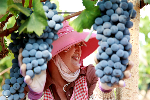 牟定縣共和鎮(zhèn)新甸村的葡萄種植基地,褪去了青澀的葡萄就像一顆顆紫色的瑪瑙掛滿枝頭,農婦手捧一串串紫瑩瑩的葡萄,感受著豐收喜悅。(黑紹祥 攝)