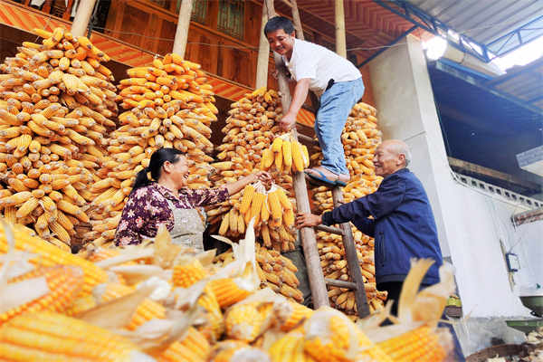 瓜果飄香,玉米實倉。農民辛勤勞作過后,又結出了豐碩成果。看著眼前堆砌成山的糧果,豐收的喜悅漸漸掩蓋了勞作帶來的倦意。(沈雷 攝)
