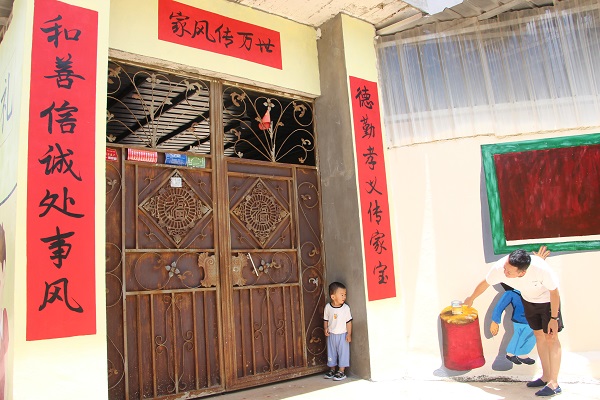 蒙自市在清廉村居建設(shè)中將鄉(xiāng)村旅游與廉文化相融合,家家戶戶一副對(duì)聯(lián)、一段家訓(xùn)、一個(gè)故事,與村內(nèi)的3D墻畫相映成趣。圖為一對(duì)游客父子在“好家風(fēng)戶”門口“探秘”。(徐雪 攝)