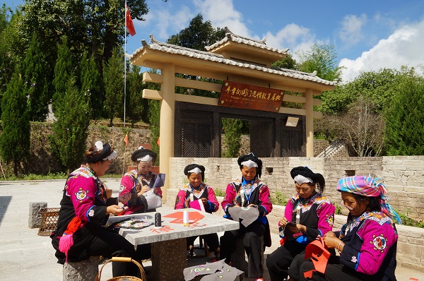 綠春縣充分整合蘊(yùn)含廉潔元素的革命遺址、愛國(guó)主義教育基地等紅色“家底”,讓游客在“一路清風(fēng)”中接受廉潔文化的熏陶和洗禮。圖為彝族婦女在該縣牛孔鎮(zhèn)平掌街國(guó)門黨性教育基地前,一針一線繡著“廉元素”圖案。(張琳努 攝)