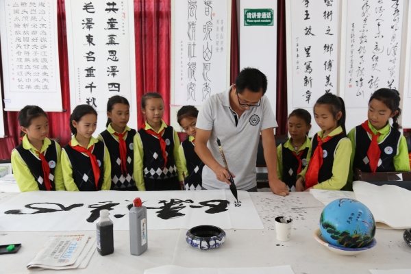 馬關(guān)縣把清廉文化滲透到校園環(huán)境布置和文化藝術(shù)活動中,通過繪“廉”寫“廉”,將清廉畫、清廉字、廉潔格言警句等遍布校園,學(xué)校處處可見“廉影”。圖為馬關(guān)縣第三小學(xué)教師為學(xué)生進(jìn)行書法培訓(xùn),書寫廉潔格言。(章荻 攝)