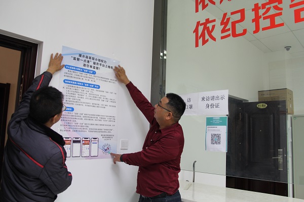 建水縣紀委監委印制發放宣傳單頁、折頁等資料,在辦事服務大廳或村(社區)公告欄、窗口顯著位置張貼宣傳海報,進一步加大“監督一點通”宣傳推廣力度。圖為該縣紀檢監察干部在信訪室張貼宣傳海報,引導群眾參與監督。(建水縣紀委監委 李蘭薇 攝)