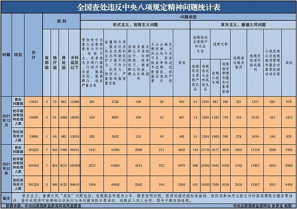 1月27日,中央紀委國家監委公布了2021年12月全國查處違反中央八項規定精神問題匯總情況。當月,全國共查處違反中央八項規定精神問題13431起,批評教育幫助和處理19489人,其中黨紀政務處分13806人。這是中央紀委國家監委連續第100個月公布月報數據。