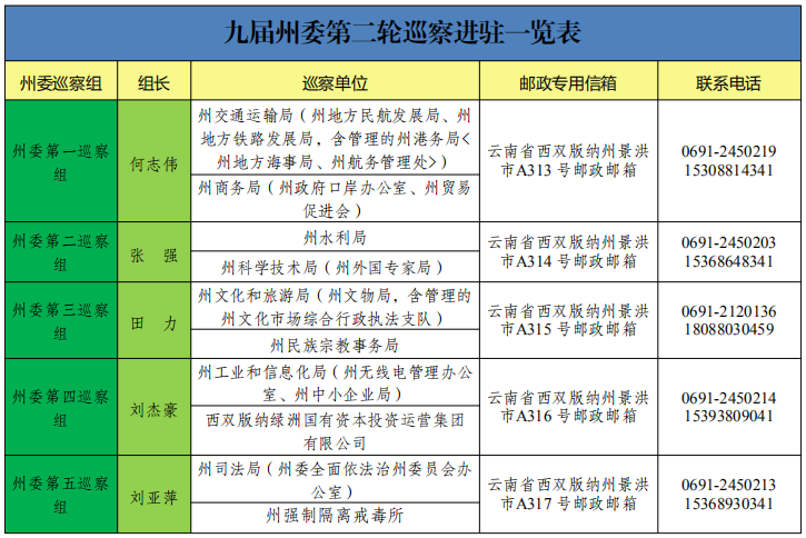 經(jīng)州委批準(zhǔn),本輪巡察分別對(duì)州文化和旅游局(州文物局,含管理的州文化市場(chǎng)綜合行政執(zhí)法支隊(duì))、州民族宗教事務(wù)局、州商務(wù)局(州政府口岸辦公室、州貿(mào)易促進(jìn)會(huì))、州科學(xué)技術(shù)局(州外國(guó)專家局)、州交通運(yùn)輸局(州地方民航發(fā)展局、州地方鐵路發(fā)展局,含管理的州港務(wù)局<州地方海事局、州航務(wù)管理處>)、州水利局、州工業(yè)和信息化局(州無(wú)線電管理辦公室、州中小企業(yè)局)、州司法局(州委全面依法治州委員會(huì)辦公室)、州強(qiáng)制隔離戒毒所9個(gè)州直部門(mén)(單位)和西雙版納綠洲國(guó)有資本投資運(yùn)營(yíng)集團(tuán)有限公司1家州屬國(guó)有企業(yè)黨組織開(kāi)展常規(guī)巡察。