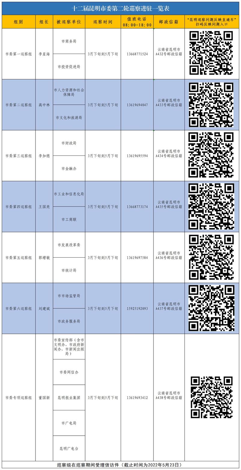 根據(jù)安排,市委巡察組將在被巡察黨組織工作2個月左右。巡察期間除開設(shè)巡察來信來電來訪渠道外,還開通了“昆明巡察問題反映直通車”,每個被巡察單位對應(yīng)一個二維碼,廣大干部群眾可通過掃描二維碼向巡察組反映問題。