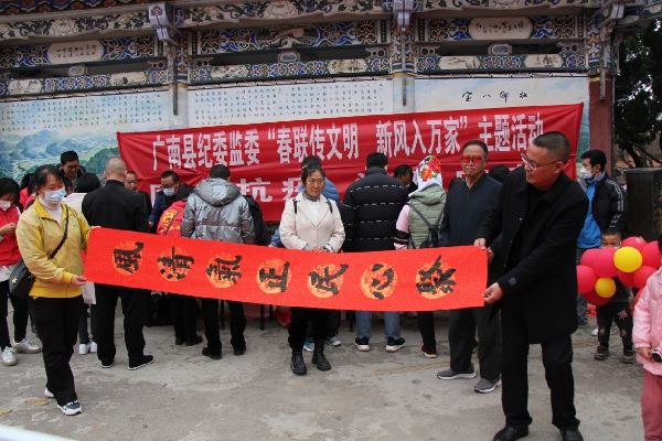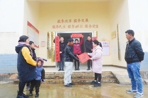 “清風(fēng)吹入村委會、廉潔走進(jìn)群眾家”“多辦村民急難事、不貪群眾一分錢”。文山市紀(jì)委監(jiān)委在春節(jié)來臨之際,根據(jù)全市152個(gè)村委會(社區(qū))黨風(fēng)廉政建設(shè)不同情況送上相對應(yīng)的廉潔春聯(lián),祝愿村委會(社區(qū))守住廉潔的前沿陣地和第一道防線。圖為該市紀(jì)檢監(jiān)察干部在壩心鄉(xiāng)壩心村送春“廉”的場景。(王銘堅(jiān) 攝)