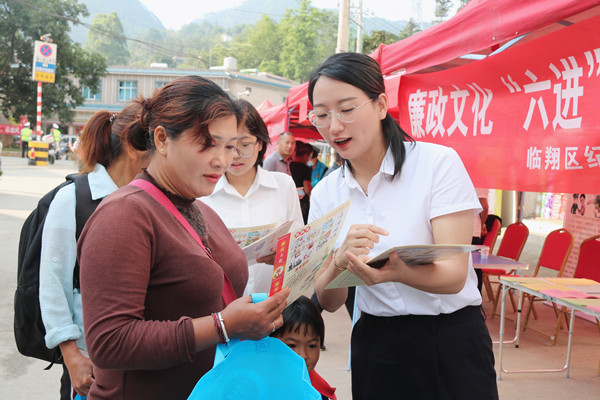 臨翔區紀委監委扎實推進新時代廉潔文化建設,強化宣傳導向,營造社會廉潔濃厚氛圍。圖為臨翔區女紀檢監察干部深入螞蟻堆鄉開展廉政文化宣傳活動,以清風廉韻促黨風、帶民風,為基層群眾獻上一場“廉政盛宴”。(王倩 攝)