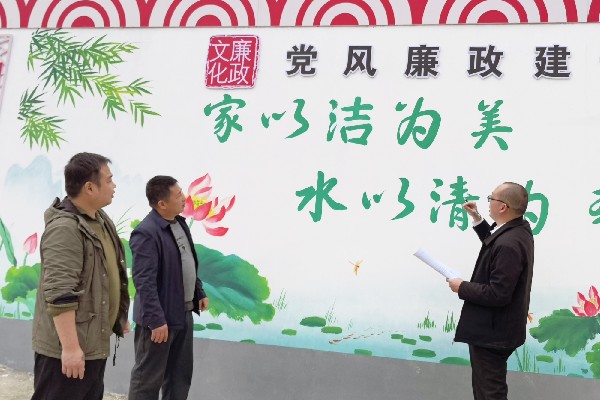 “廉語(yǔ)”畫墻上,“廉意”記心間。西疇縣紀(jì)委監(jiān)委不斷豐富載體形式,通過(guò)打造廉潔文化墻,用圖文并茂的方式,把廉潔文化融入群眾生活,進(jìn)一步增強(qiáng)廉潔文化的滲透力和感染力。圖為該縣新馬街鄉(xiāng)紀(jì)委干部在坡腳村委會(huì)石碑村小組向群眾“說(shuō)廉”。(李吉靜 攝)