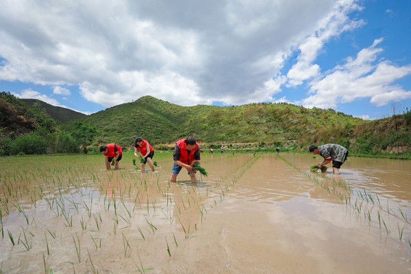 插秧農(nóng)忙時節(jié),陸良縣紀(jì)委監(jiān)委黨員志愿者利用周末休息時間到鄉(xiāng)村振興聯(lián)系點芳華鎮(zhèn)雨補(bǔ)村幫助群眾栽插秧苗。