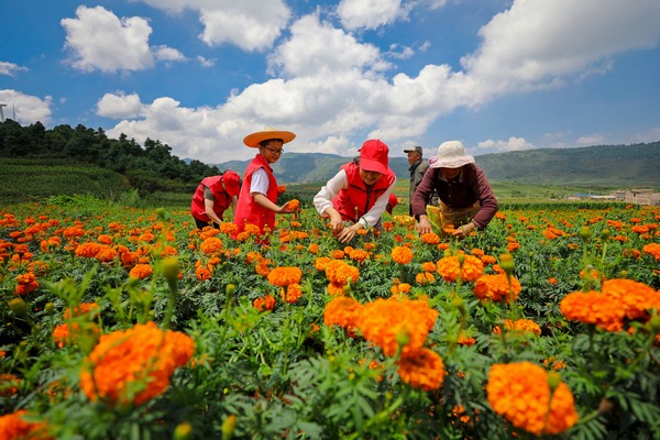 陸良縣紀(jì)委監(jiān)委黨員志愿者到活水鄉(xiāng)雨麥紅村,幫助缺乏勞動力的農(nóng)戶采摘萬壽菊,助力農(nóng)業(yè)生產(chǎn),確保農(nóng)民增收。