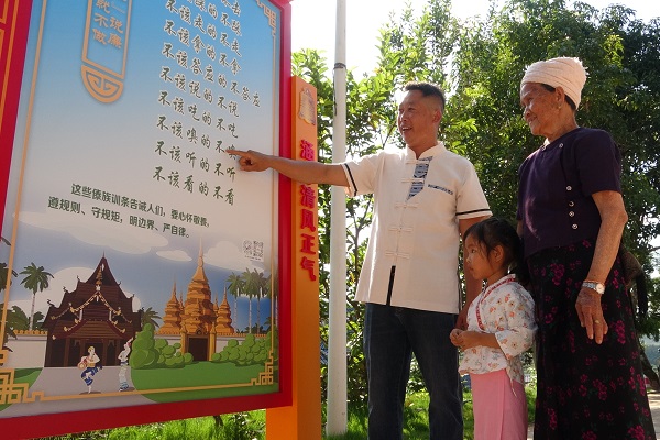 景洪市紀(jì)委監(jiān)委充分發(fā)揮監(jiān)督“末梢”作用,聚焦群眾需求,用群眾聽得懂的方言俚語,常態(tài)化開展“送廉上門”服務(wù),進(jìn)村入戶宣講群眾喜聞樂見的廉潔故事,讓陣陣“清風(fēng)”吹進(jìn)村居。圖為該市大渡崗鄉(xiāng)村(居)務(wù)監(jiān)督委員會主任為傣族“咪濤”和“小龍英”講解廉潔諺語。(張燦坤 攝)