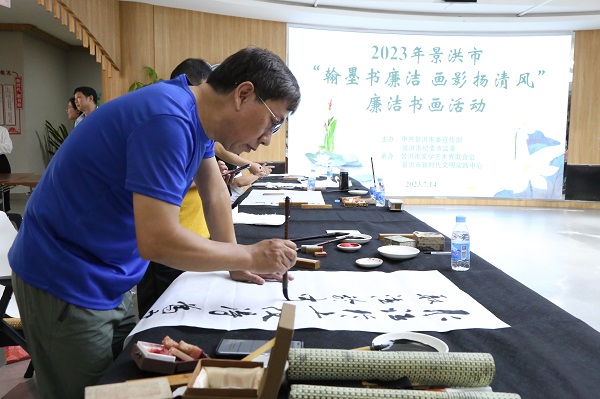 景洪市將廉潔文化與書法、繪畫等載體相結(jié)合,創(chuàng)新廉潔教育形式,組織開展“翰墨書廉潔畫影揚清風(fēng)”廉潔書畫活動,讓廣大干部群眾接受結(jié)束熏陶的同時,又能切身感受廉潔文化的魅力。圖為該市書法家協(xié)會的藝術(shù)家代表現(xiàn)場創(chuàng)作書法作品。(李秋苒 攝)