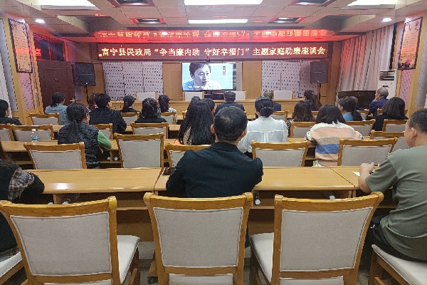 富寧縣紀委監委制定“六個一”家庭助廉活動方案,進一步發揮家庭在助廉教育中的作用,引導全縣各級各單位開展家庭助廉活動,從源頭上筑起“防腐線”。圖為該縣民政局組織干部職工家屬召開家庭助廉座談會,并觀看警示教育片。(樊艷 攝)