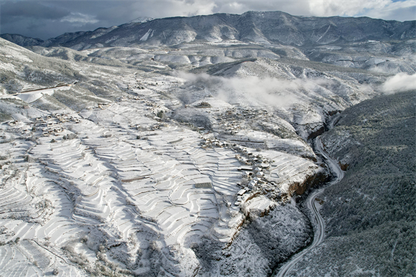 霧靄、山川、梯田,穿上“雪服”的香格里拉市尼西鄉(xiāng)湯滿村,鋪上了浪漫的雪景。(孫諾都杰 攝)