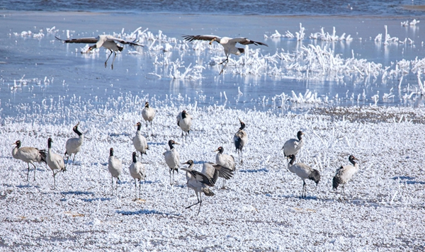 青山不老,為雪白頭。在海拔高達3100米的昭通市大山包風景區(qū),國家一級保護動物--黑頸鶴成群結隊到這里越冬,為寂靜悠遠的雪景添上一絲溫馨的生靈氣息。(付宇紅 攝)