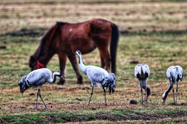 大雪時節(jié),麗江拉市海迎來最美的季節(jié),大量遷徙的候鳥選擇在拉市海過冬。在冬日暖陽下,灰鶴悠閑地邁著步,在草灘邊覓食。(鄧志剛 攝)