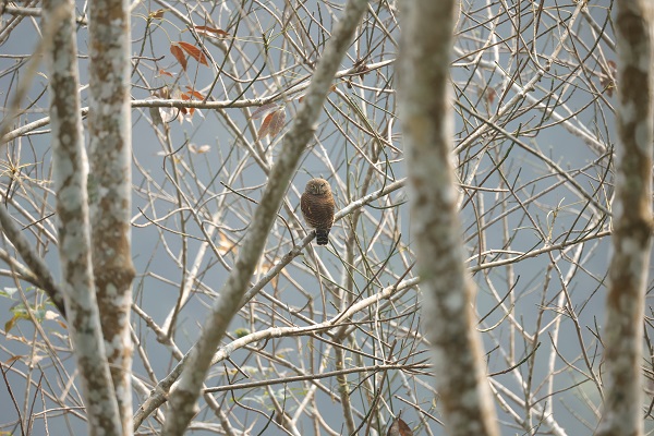 大雪時節(jié)將至,秋葉所剩無幾,林間萬物潛藏。西雙版納州納板河流域國家級自然保護區(qū)的樹林間,斑頭鵂鹠矗立在枝頭。它的體態(tài)端莊、眼神犀利,它“暗”中觀察、“耳”聽八方,猶如一位士兵,保衛(wèi)著森林的安全。(陳典 攝)