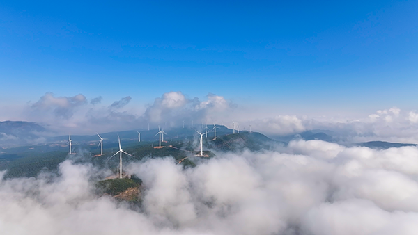 在曲靖市的諸葛南山,流沙薄霧漫過山巒,風(fēng)力發(fā)電場在霧中若隱若現(xiàn),宛若仙境。(楊富貴 攝)