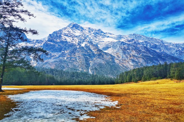 麗江云杉坪風(fēng)景治愈,時(shí)光悠然,綿延的草甸、林線、冰川、雪峰由近至遠(yuǎn),層層推移,立體景觀,多姿多彩。草甸在冬日暖陽的照耀及雪水的沁潤下,漸漸滋生萌發(fā)。(舒英妹 攝)