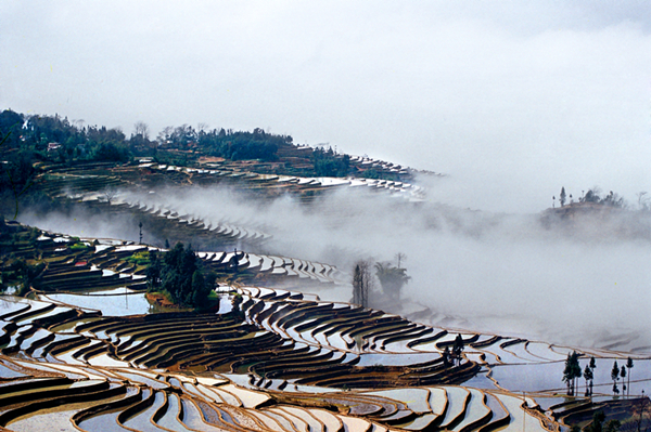 紅河哈尼梯田層層疊疊,阡陌縱橫交錯(cuò),山間云霧繚繞,波光粼粼的梯田如詩如畫,恍若仙境。(馬理文 攝)