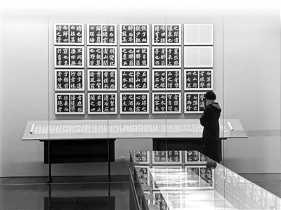 圖④:一位游客在北京畫院美術(shù)館觀賞書畫,懸在墻上的拓片是歐陽修的名篇《醉翁亭記》。