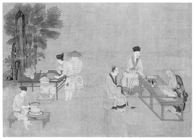 文人雅集總是少不了茶,這是南宋畫家劉松年的《攆茶圖》,右邊的三位文人,一人伏案寫字,另外兩人旁觀;左邊的兩位茶博士,一人坐在矮幾上磨茶,另一人立在桌邊,正提著湯瓶點茶,畫面中的茶具非常多,展現的是宋代的點茶技藝。資料圖片