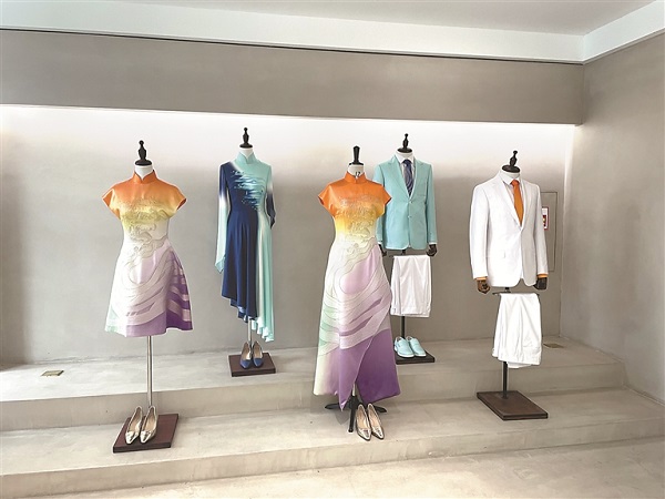 色彩以“虹韻紫、月桂黃、水墨白、湖山綠”為底,圖案以西湖十景寫意……博亞服飾有限公司一樓展廳展示的杭州亞運會頒獎禮服,盡顯杭州韻味。 本網記者 瞿芃 攝