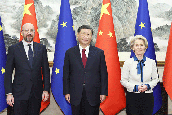 12月7日,國家主席習近平在北京釣魚臺國賓館會見來華舉行第二十四次中國-歐盟領導人會晤的歐洲理事會主席米歇爾和歐盟委員會主席馮德萊恩。新華社記者 黃敬文 攝