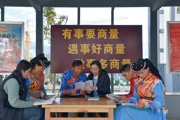 云南省蘭坪白族普米族自治縣堅持用身邊事教育身邊人,增強警示教育的針對性,讓警示教育入腦入心。圖為該縣翠屏街道紀工委工作人員到易地搬遷點永昌社區同社區干部共同學習《怒江州2020年至2022年黨員干部違紀違法典型案例》中的村(社區)干部違紀違法案例。楊梅瑛 攝