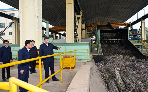 隨后,習(xí)近平到來賓東糖鳳凰有限公司考察。他進(jìn)入生產(chǎn)車間察看制糖工藝和作業(yè)流程,在公司展廳了解糖業(yè)產(chǎn)品種類及市場份額和發(fā)展趨勢。他強調(diào),我國糖業(yè)面臨激烈的國際競爭,要按照高端化、智能化、綠色化要求,加大科技創(chuàng)新力度,延伸產(chǎn)業(yè)鏈、提高附加值,不斷提質(zhì)、降本、增效,推動高質(zhì)量發(fā)展。離開企業(yè)時,習(xí)近平熱情地對前來歡送的員工們說,食糖是重要的副食品,大家為此辛勤勞動,為千家萬戶送去了“甜蜜”。希望大家不斷學(xué)習(xí)新技術(shù)、采用新工藝,為糖業(yè)發(fā)展作出新貢獻(xiàn)。