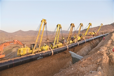 中俄東線天然氣管道南段一施工現場正在進行管道下溝作業。