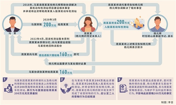 2018年,馬某因某機動車檢測站項目建設一直未能有效推進,請周某某找楊元輝幫助協調解決,并承諾將出資幫助周某某入股某機動車檢測站(該檢測站由老板張某全額出資,馬某不占有股份,僅提供場地收取租金),周某某遂將請托事項告知楊元輝,楊元輝協調解決了相關事宜,該項目得以順利推進。2020年3月,馬某轉賬200萬元給周某某,周某某將該200萬元轉入張某賬戶,完成了形式上的入股,周某某未實際參與該檢測站的經營管理。周某某將上述情況告知楊元輝,楊元輝表示默許。2022年4月,因該檢測站暫未獲利,周某某未獲得分紅,且需要資金周轉,向馬某提出退股并要回該200萬元,馬某以檢測站未獲利拒絕回購該股份,多次協調后周某某向馬某提出退股只需給她160萬元即可,馬某表示還需再考慮,周某某向楊元輝說明馬某不同意退股,楊元輝出面要求馬某處理好此事,馬某協調張某轉給周某某160萬元。