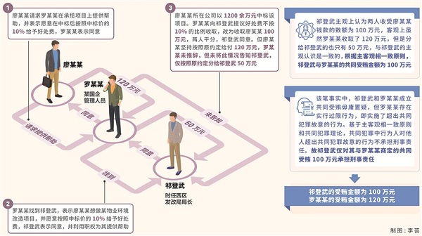 廖娟:關于該起事實受賄數額的認定。最初,廖某某找羅某某幫其承攬項目時,表示愿意按中標價的10%給予好處費。隨后,羅某某尋求祁登武幫助時二人也就收取10%好處費達成合意。但該項目以1200余萬元的價格中標后,羅某某認為項目利潤不高,且廖某某缺乏從事建筑行業經驗,遂向祁登武提議好處費不按10%的比例收取,改為收取廖某某100萬元,祁登武表示同意。此時,二人對共同受賄100萬元、各自分得50萬元達成最終合意。后羅某某在收取廖某某好處費時告知其只需給付100萬元,但廖某某堅持按照最初約定仍給付好處費120萬元,羅某某未再推辭。羅某某并未將已收取120萬元好處費的情況告知祁登武,仍按照二人的約定分給祁登武50萬元。綜合認定,該筆事實中,祁登武和羅某某成立共同受賄毋庸置疑,但羅某某存在實行過限行為,即實施了超出共同犯罪故意的行為?;谥骺陀^相一致原則和共同犯罪理論,共同犯罪中行為人對他人超出共同犯罪故意的行為不承擔刑事責任。故本起事實中,祁登武僅對其與羅某某共同受賄100萬元承擔刑事責任,認定祁登武的受賄數額為100萬元,羅某某的受賄數額為120萬元。