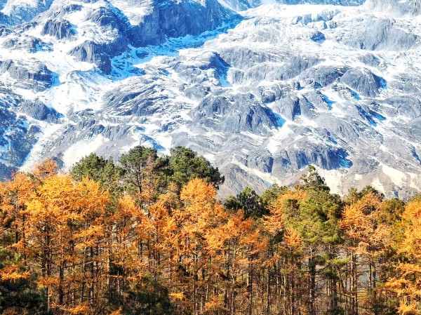 葉片黃透的麗江云杉環繞在玉龍雪山山腳,與雪山交相輝映,形成一幅絢爛多彩的冬日畫卷。(八一拉金 攝)