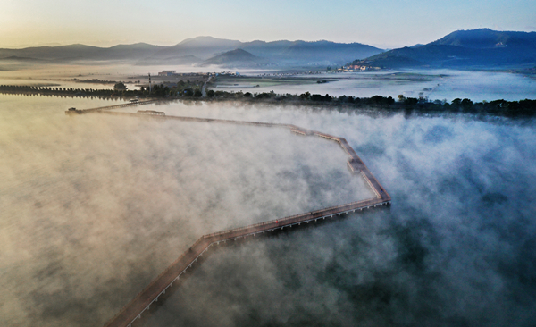 在薄霧的掩映下,小寒時節的高原明珠石屏異龍湖猶如一幅水墨畫。(胡斌 攝)