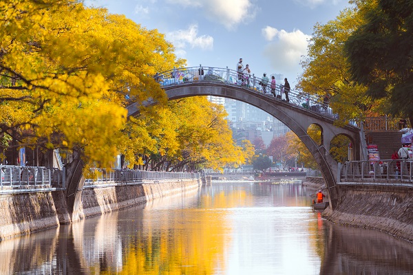 在“昆明藍”的映襯下,冬日大觀河兩岸金燦燦的滇樸顯得更加艷麗耀眼,河水波光粼粼,天光云影共徘徊,仿佛是一幅濃墨重彩的油畫。(陳思思 攝)