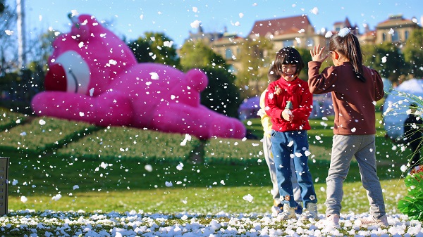 在曲靖市的金陵灣愛情小鎮,人工雪花機灑落著雪花,吸引眾多市民前來打卡戲“雪”。(方俊 攝)