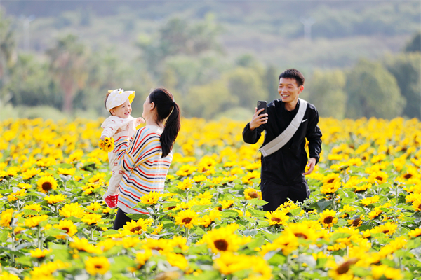 天氣常如二三月,花枝不斷四時春。驚蟄時節,昆明市東川區大片的向日葵競相開放,匯聚成一片金燦燦的花海,引得市民紛紛前來打卡。(吳建坤 攝)