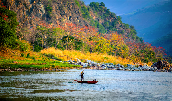 驚蟄已至,春氣萌動。玉溪市新平縣戛灑江畔木棉花悄然綻放。江水粼粼,輕悠的小舟在江面上輕輕蕩漾,呈現出一幅美麗祥和的春景圖。(楊會 攝)