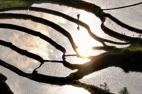 鎮雄縣母享鎮的水田里已經栽種好的嫩綠秧苗在霞光下隨風搖曳,呈現出一片生態和諧、生機盎然的景象。(郭萬聰 攝)