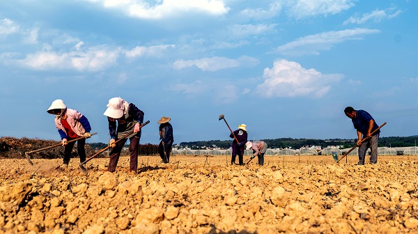 在馬龍區椿樹制種基地里,農民們搶抓農時進行間苗作業,田間地頭呈現一派繁忙景象。(方俊 攝)