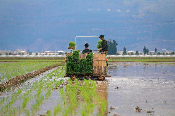 芒種時節雨滿田,正適合水稻栽插生長。在陸良縣三岔河鎮天寶社區優質水稻種植基地,農民正駕駛插秧機栽插水稻,宛如一幅精美的水墨畫卷徐徐展開。(劉易瑢 攝)