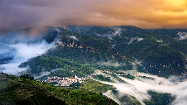 朝陽初升,草木更深。祿勸縣雪山鄉集鎮在晨霧的籠罩下漸漸蘇醒,金色的光線穿透云層,灑在濕潤的大地上,綠意盎然,仿佛一幅油畫。(鄧洪 攝)