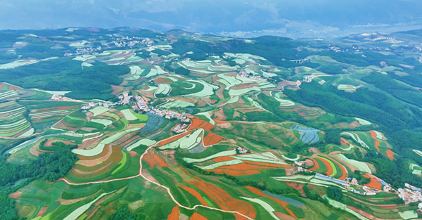 秋風踏著輕盈的腳步翩然而至,好似巧手姑娘一般將東川紅土地裝扮得五彩斑斕,絢爛多姿。(字亞萍 攝)