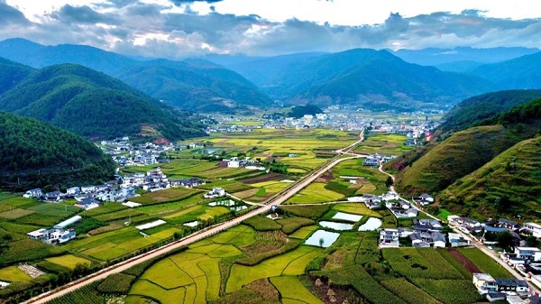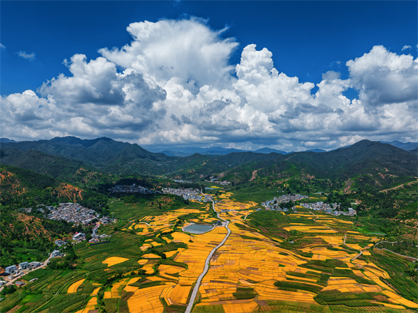 寒露至,秋更濃。祥云縣自羌朗村成熟的稻田像一片金黃的海洋。(戴國輝 攝)