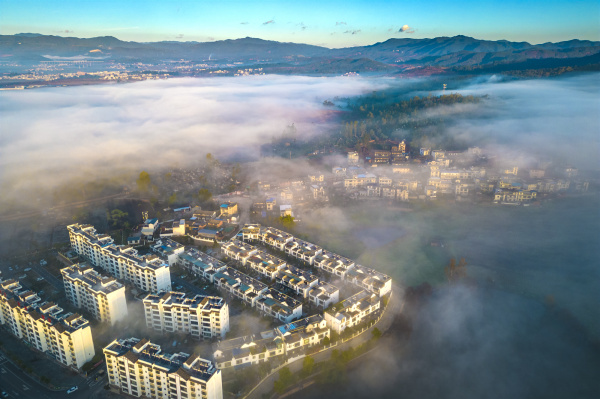 小雪時(shí)節(jié),牟定縣的茅州城在淡淡的霧氣中蘇醒,層巒疊嶂、錯(cuò)落有致的樓房披上了一層薄紗。(李林先 攝)