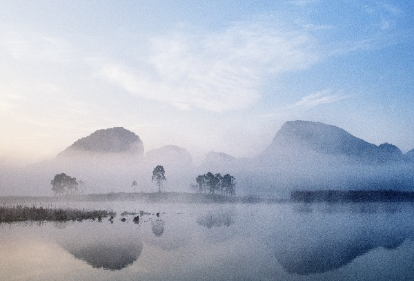 氤氳霧氣似一層白色的輕紗,飄散在山間、湖面,讓普者黑濕地像極了一幅清雅恬淡的丹青水墨畫。(曾瑩 攝)