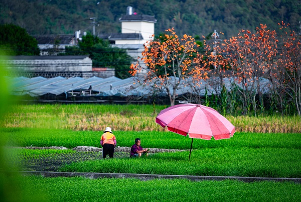 小雪時(shí)節(jié),梁河縣曩宋阿昌族鄉(xiāng)的田間綠意仍濃。一把撐開的粉色大傘為兩位正在辛勤勞作的菜農(nóng)投下一片陰涼。(何成江 攝)