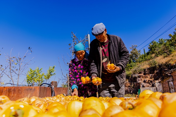 小雪來臨,晝夜溫差加大。趁天朗氣清,沾益區(qū)德澤鄉(xiāng)村民忙著采摘柿子,去皮晾曬,準(zhǔn)備做成柿餅,醞釀冬日甜蜜。(楊靜昆 攝)