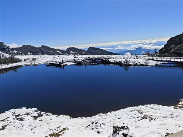 小雪節(jié)氣臨近,祿勸縣轎子雪山也迎來了自己的“換裝季”。天池湖畔銀裝素裹,草木上掛滿了晶瑩的冰掛,樹木與湖面相互映襯,共同勾勒出一幅冬日里獨(dú)有的畫卷。(何云興 攝)